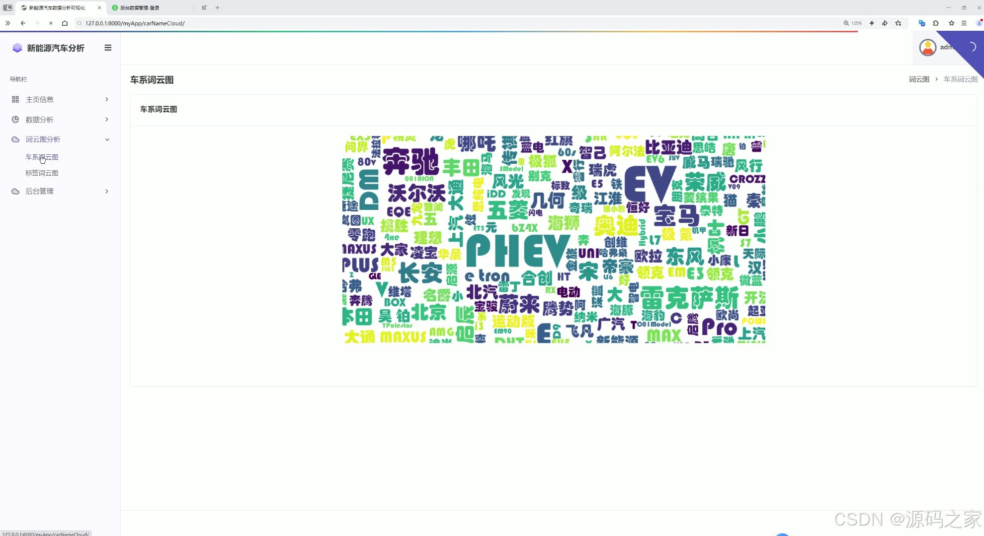 这是新能源汽车数据分析可视化系统的车系词云图页面,左侧为包含主页信息、数据分析、词云图分析、后台管理等模块的导航栏,主区域展示车系词云图,以不同大小和颜色的文字呈现各车系、动力类型等信息,直观展示相关数据的热度与分布情况。