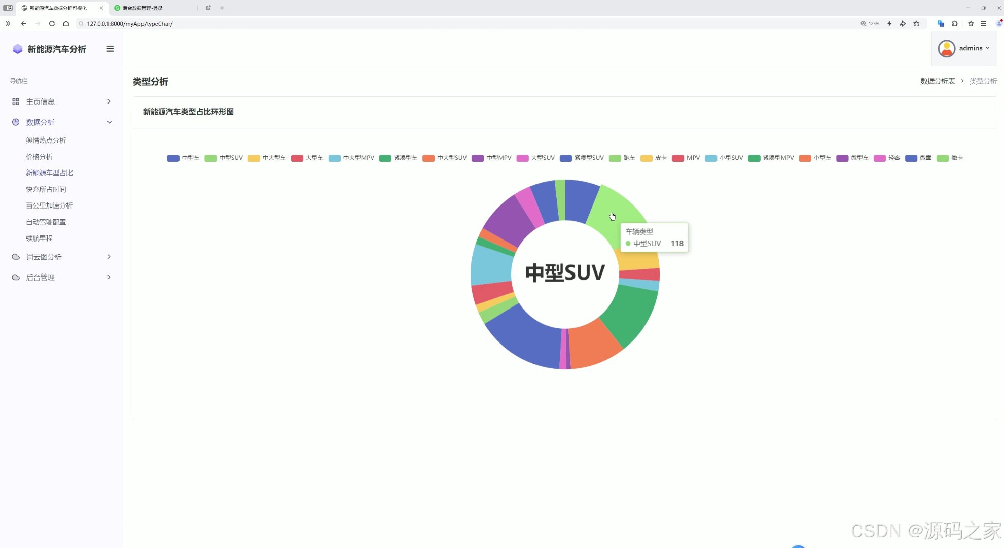这是新能源汽车数据分析可视化系统的类型分析页面,左侧为包含主页信息、数据分析、词云图分析、后台管理等模块的导航栏,主区域展示新能源汽车类型占比环形图,直观呈现不同类型新能源汽车的分布占比情况,清晰展示各类车型的占比差异。