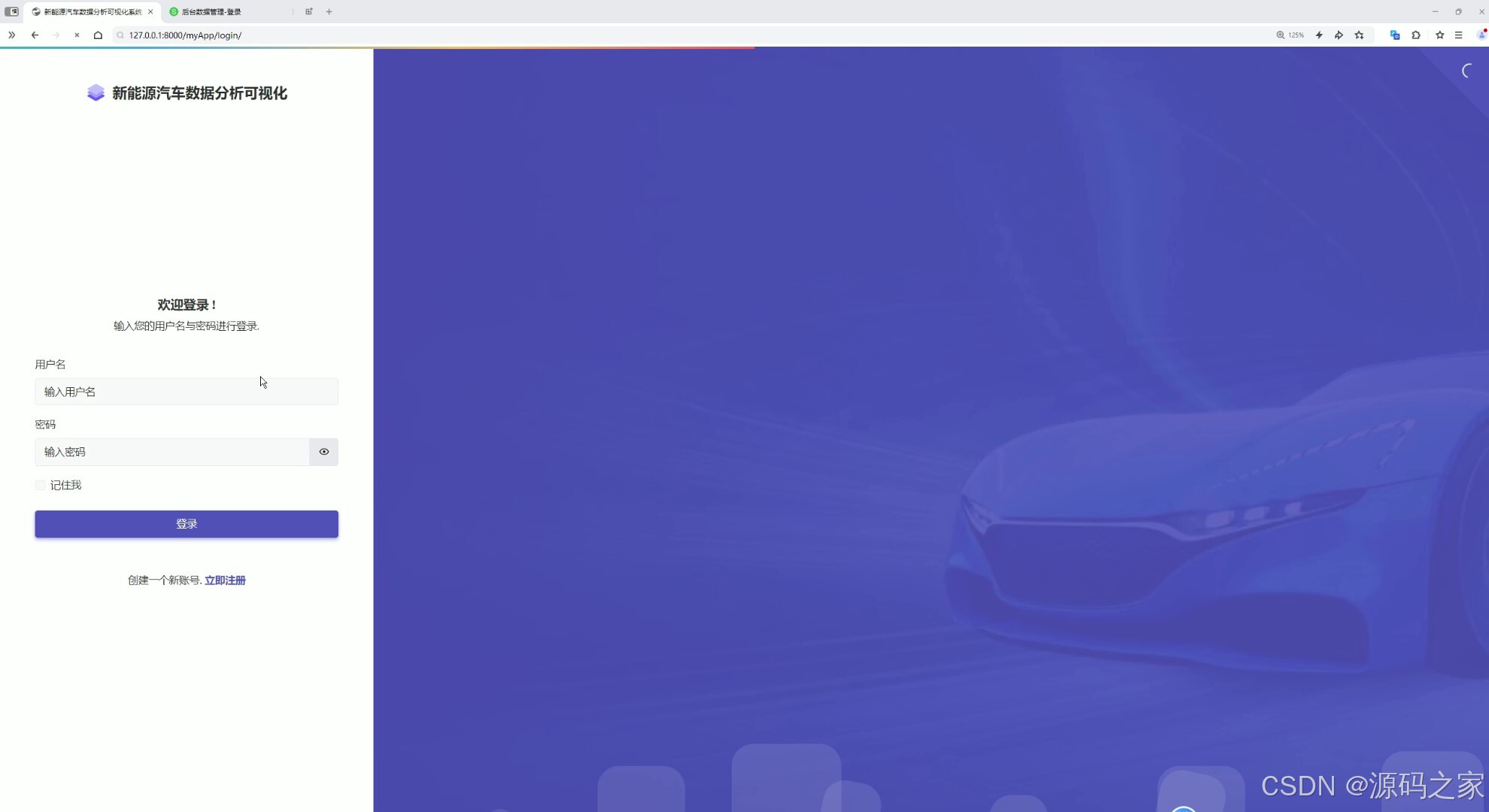 这是新能源汽车数据分析可视化系统的登录页面,左侧为登录功能区,包含用户名和密码输入框、记住我选项、登录按钮以及注册入口,右侧为装饰性背景,用于验证用户身份,只有成功登录后才能进入系统的数据分析、管理等功能模块。