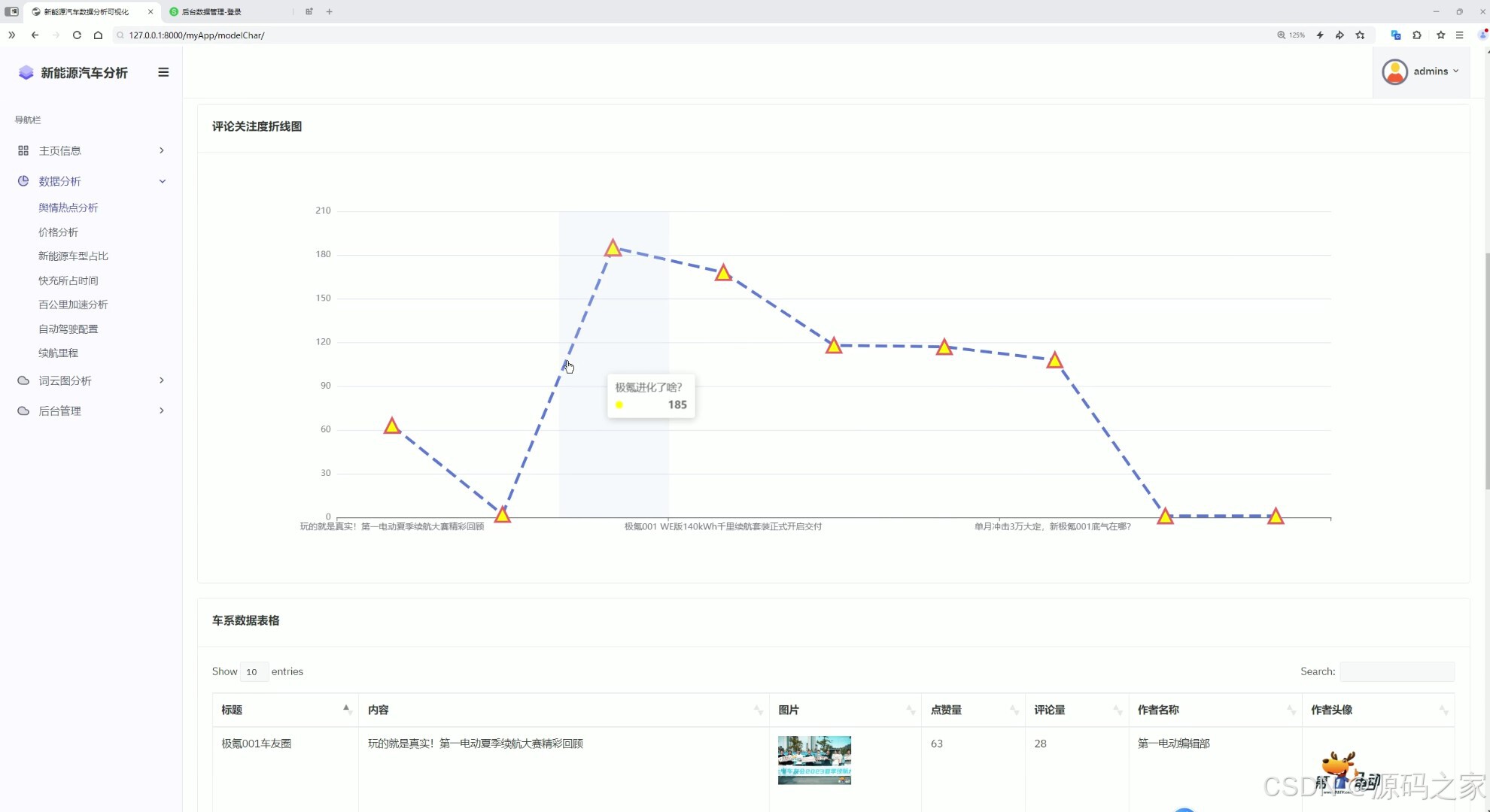 这是新能源汽车数据分析可视化系统的数据分析页面,左侧为包含主页信息、数据分析、词云图分析、后台管理等模块的导航栏,主区域上方展示评论关注度折线图,呈现相关话题热度变化,下方为车系数据表格,展示相关内容的互动数据,支持搜索与分页查看。