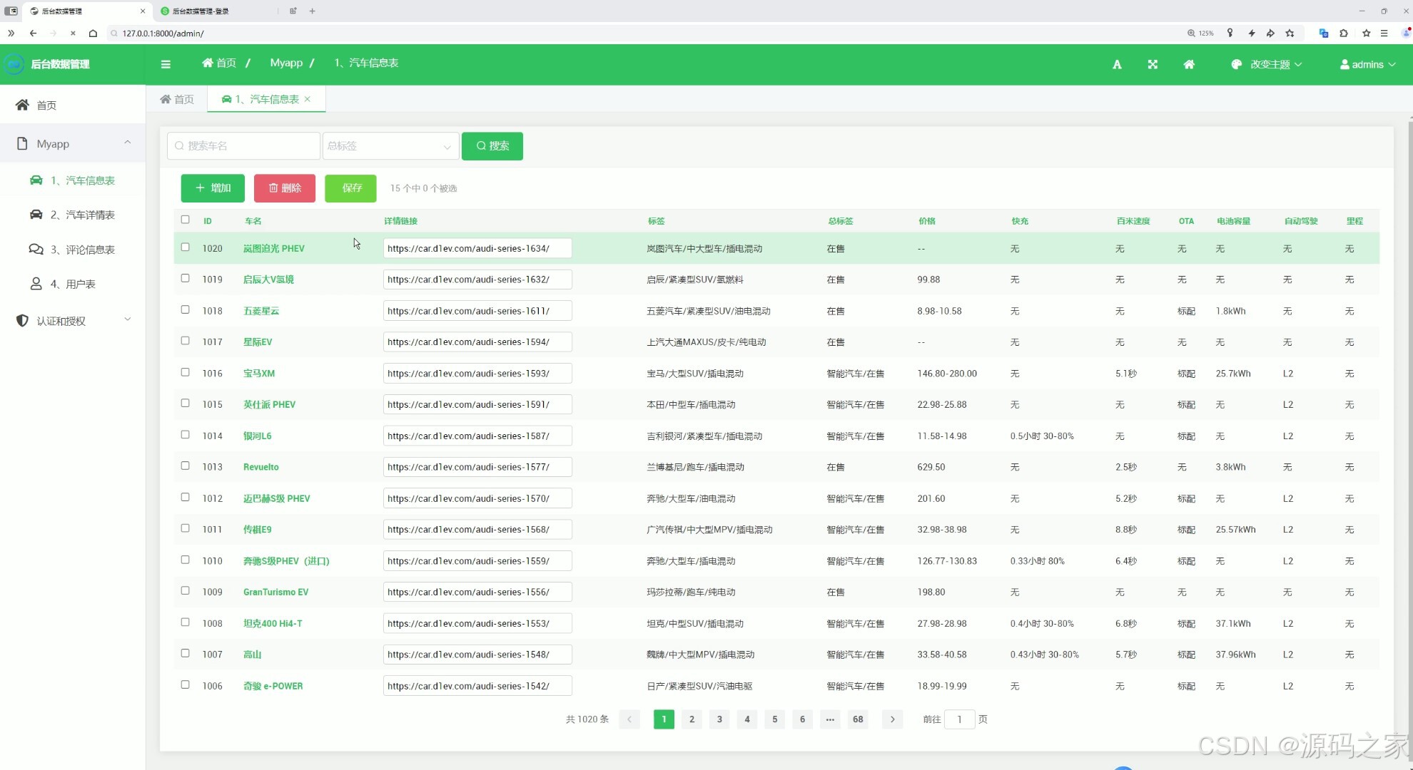 这是新能源汽车数据分析可视化系统的后台数据管理页面,左侧为包含首页、汽车信息表、评论信息表、用户表等模块的导航栏,主区域展示汽车信息表,支持搜索、增加、删除、保存等操作,可分页查看和管理车辆的详细数据信息。