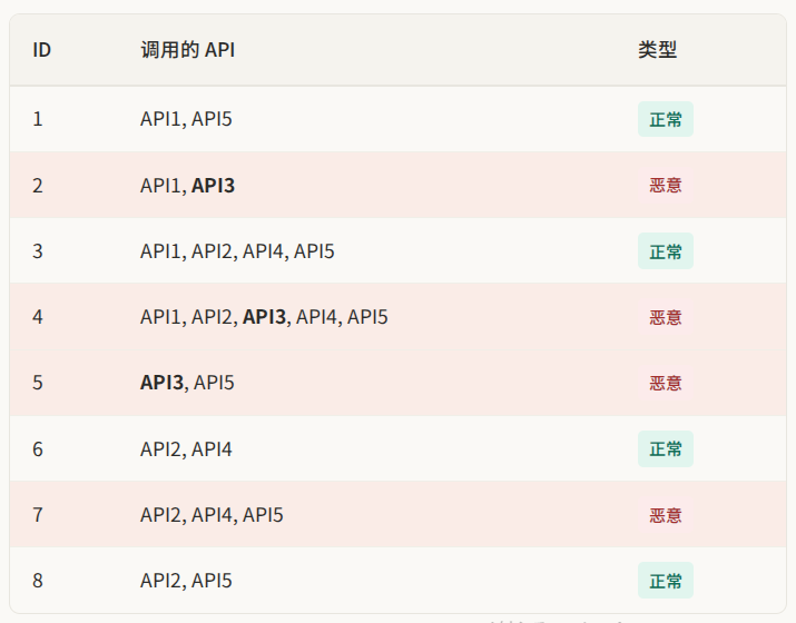 - 规则 2:{API1, API3} → Malicious(支持度 25%,置信度 100%)