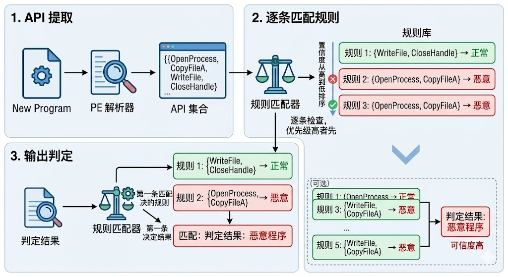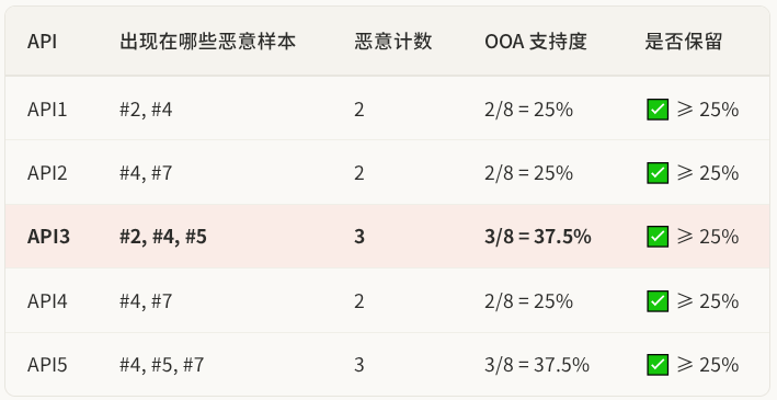 第二轮的关键启示:虽然 API1 单独看在恶意样本中出现了 2 次(通过了第一轮),但它和 API2、API4、API5 的组合都只出现了 1 次,全部被淘汰。这说明 API1 虽然在恶意程序中有一定存在感,但它和其他 API 的"协同出现"模式并不突出------它更像是一个通用 API,恶意和正常程序都在用。唯一保留的是 {API1, API3},因为 API3 本身就是一个强恶意指标。