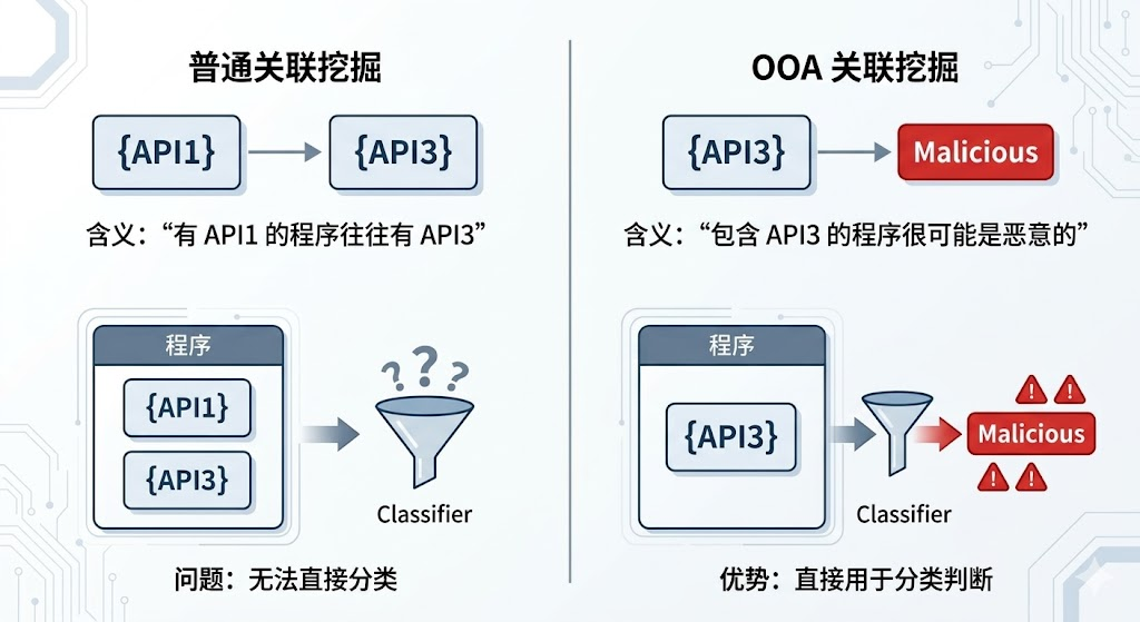 但OOA 在挖掘之前就锁定了一个目标 (Objective):找出"哪些 API 组合和恶意标签强相关"。这让算法从一开始就朝着分类的方向搜索。