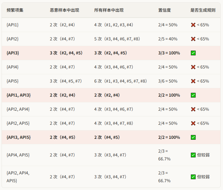 置信度就是用来检验"区分能力"的:confidence = 该 API 组合在恶意样本中的出现次数 ÷ 该组合在所有样本中的出现次数。只有置信度超过 moc = 65% 的才保留。
