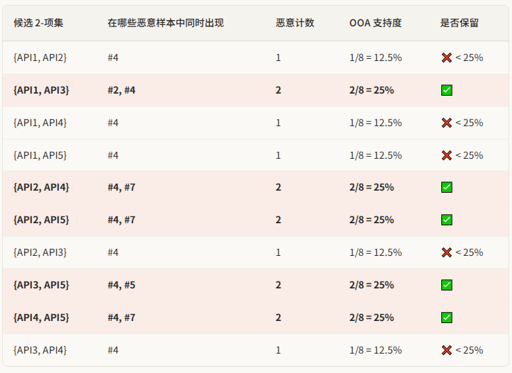 下面我们用上面的示例数据(8 个样本、5 种 API),以目标 Obj1 = Malicious、mos = 25%(即至少出现 2 次)、moc = 65% 为阈值,完整走一遍 OOA_Apriori 的每一步。