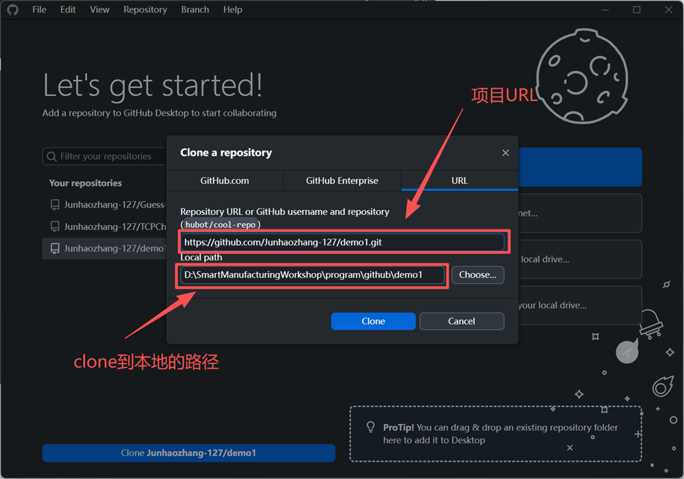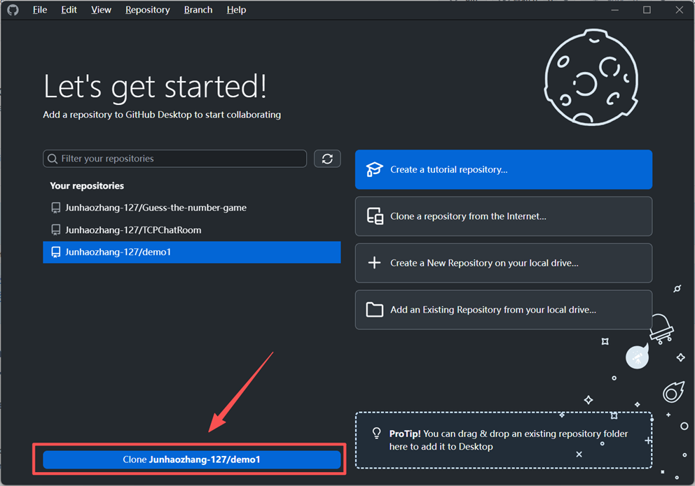 选中仓库后,点击下方的克隆按钮。GitHub Desktop 会准备将该仓库从 GitHub 远程端复制到本地电脑。