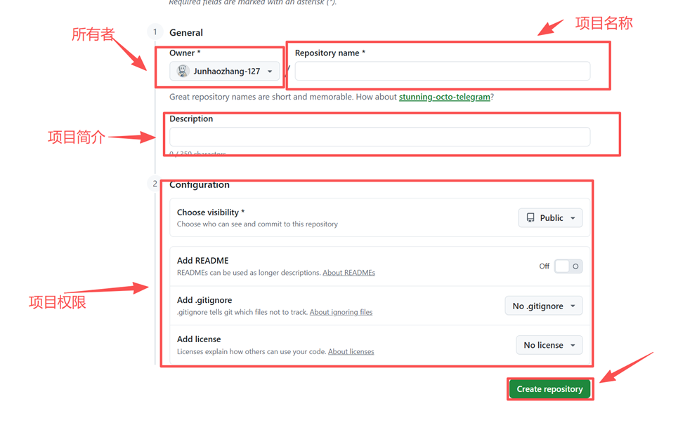 - Repository name:表示项目名称,建议简洁明确,尽量使用英文或规范命名。