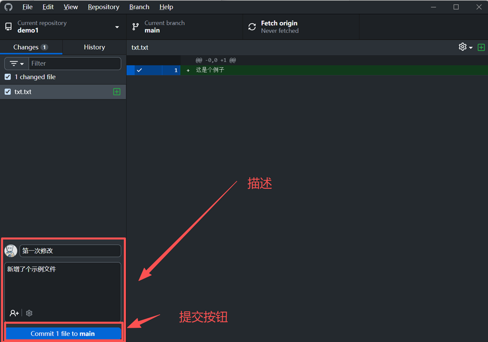 确认改动无误后,需要在左下角填写提交说明。一般至少要写一个简洁明确的标题,概括本次修改的核心内容。然后点击底部的提交按钮,将修改保存为一次本地 commit。