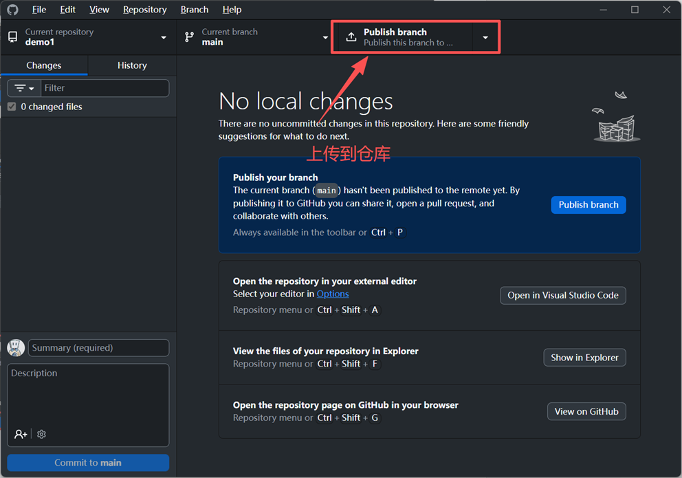 完成本地提交后,右上角会出现用于同步远程仓库的按钮。截图中显示的是 Publish branch 。在不同情形下,也可能看到 Push origin 。两者的共同目标都是:把本地已经提交的内容上传到 GitHub。