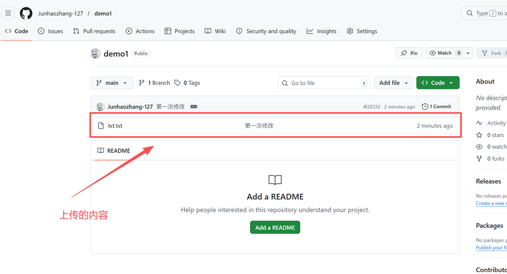 最后,再回到 GitHub 仓库网页端。此时可以看到仓库中的 README 或其他文件已经更新,页面上通常还会显示最近一次提交时间与对应内容。这说明从"网页端建仓"到"本地修改并上传"的完整流程已经闭环完成。