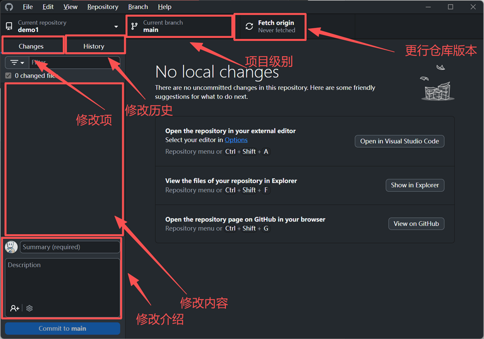 四、认识 GitHub Desktop 的项目主界面