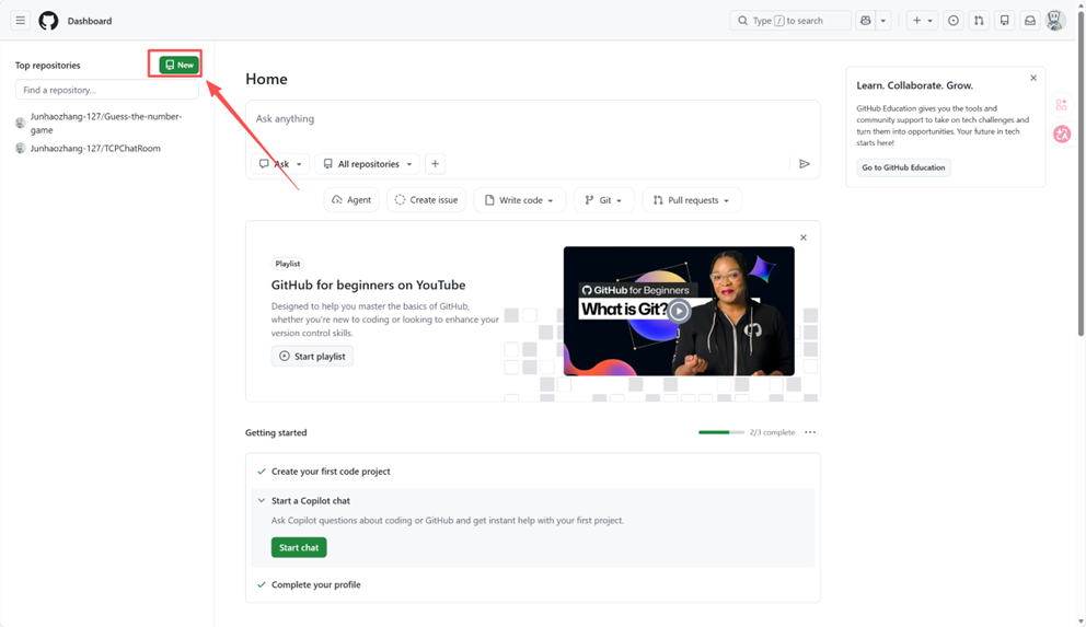 1. 进入 GitHub 首页并点击新建仓库