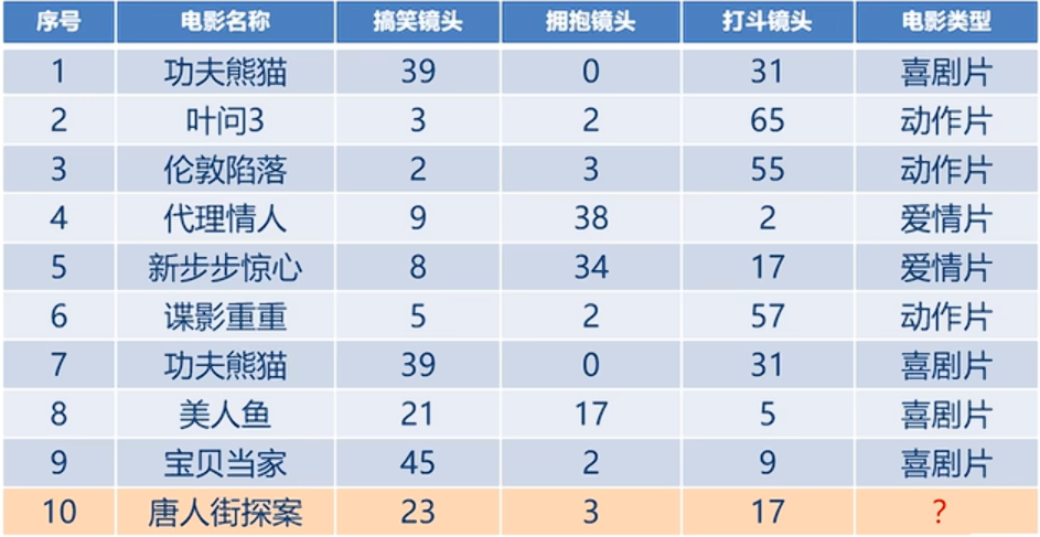 就如利用K近邻算法预测电影类型,如下表,其中1到9的电影名称以及三个不同类别的镜头为x_train,对应的电影类型为y_train,而第10个的电影名称以及三个不同类别的镜头为x_test,我们要预测的就是其对对应的电影类别y_test。