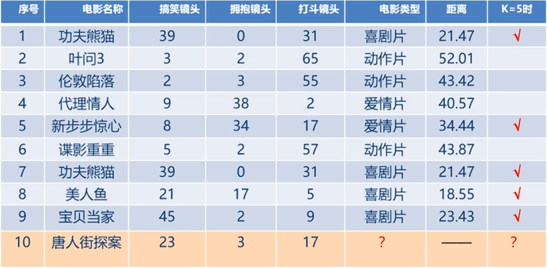 这时K近邻,若K等于5,则是找最近的5个进行投票,这个5个中那个电影类型多,则第10个电影的类型就是谁。
