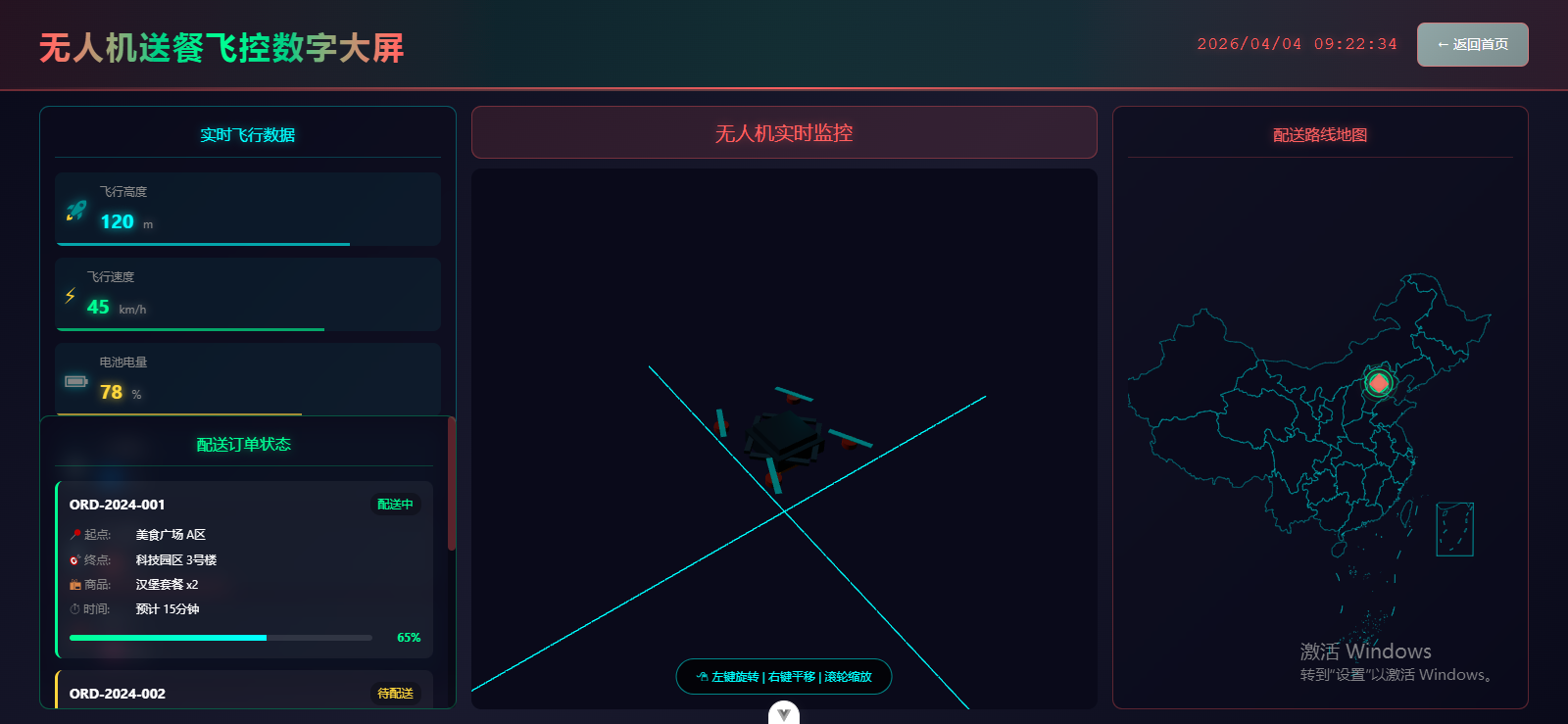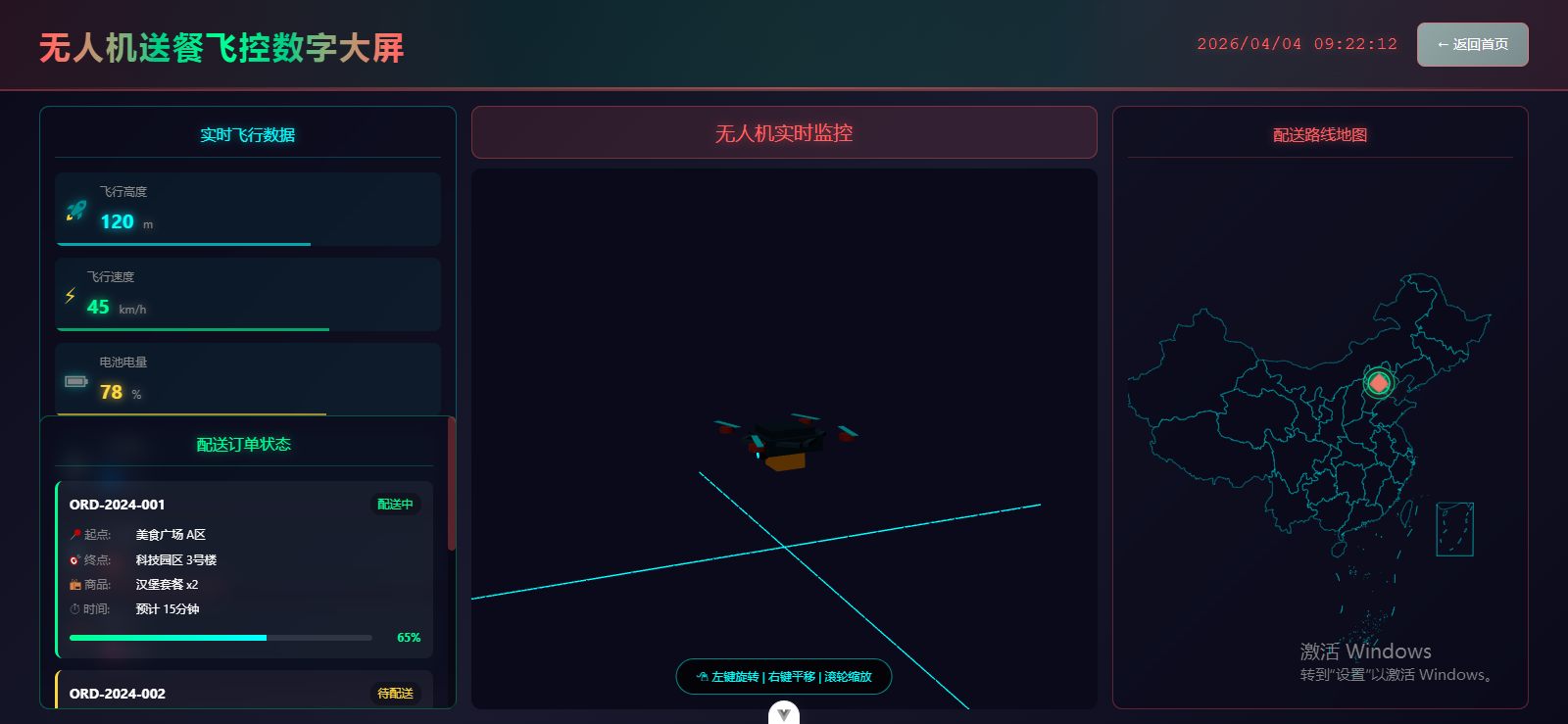 基于 Vue 3 的无人机送餐飞控数字大屏实现,包含实时飞行数据、动态地图轨迹、订单进度模拟等核心功能,采用深色科技风 UI,并适配鼠标交互提示。