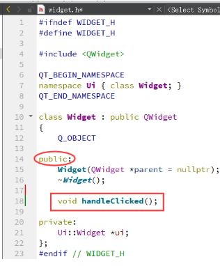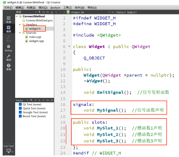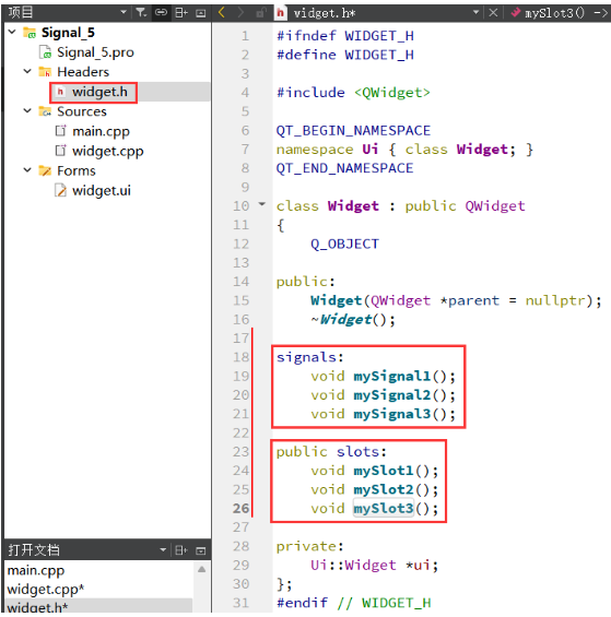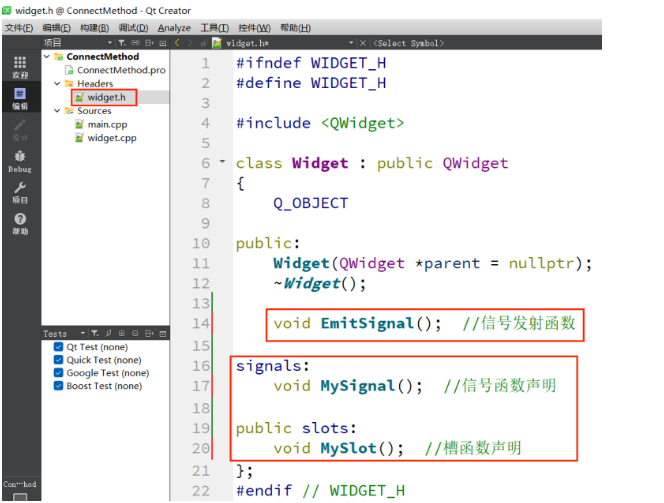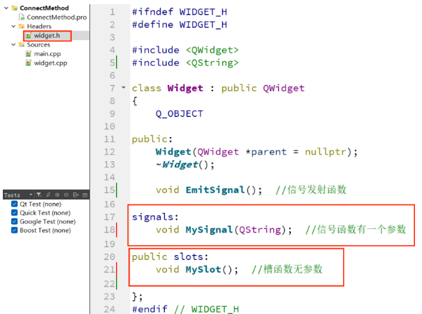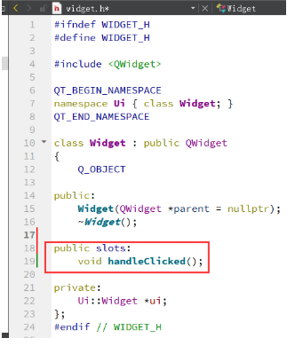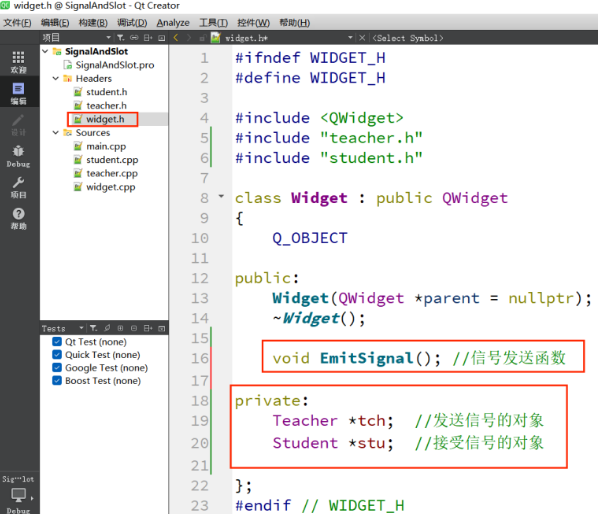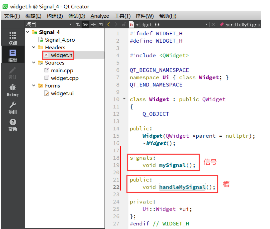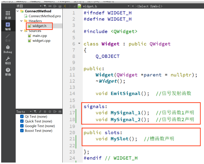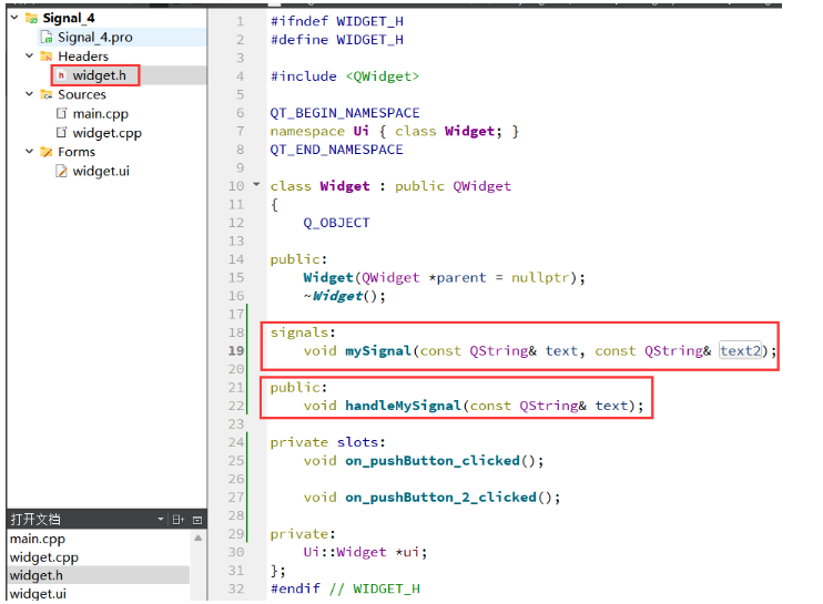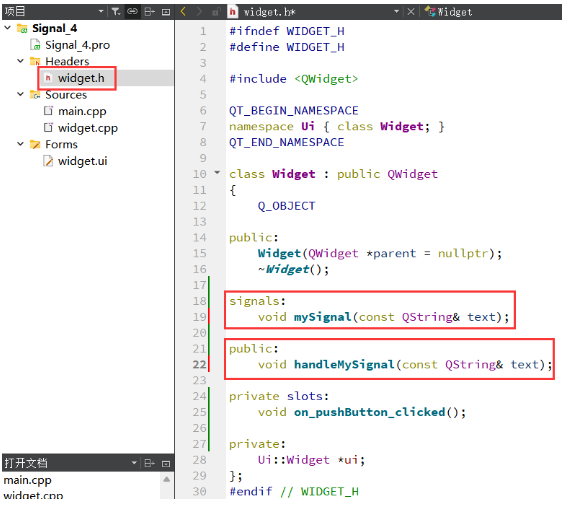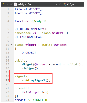 在 "widget.h" 中声明信号和槽以及信号发射函数:
