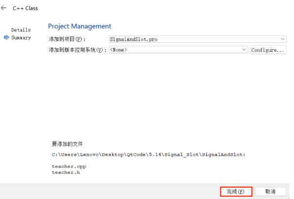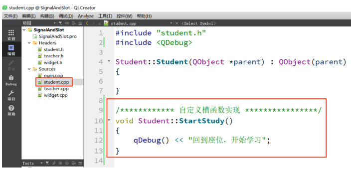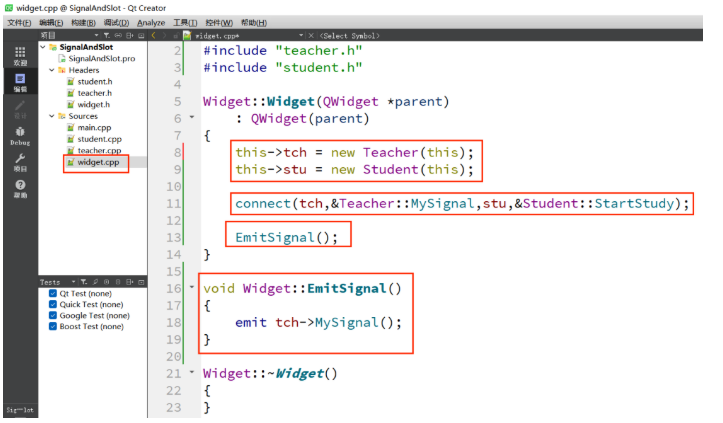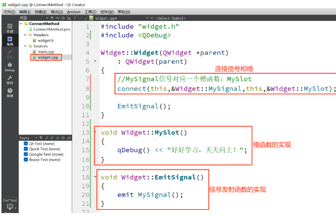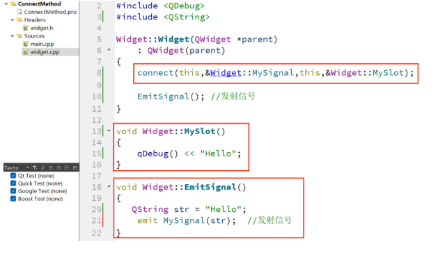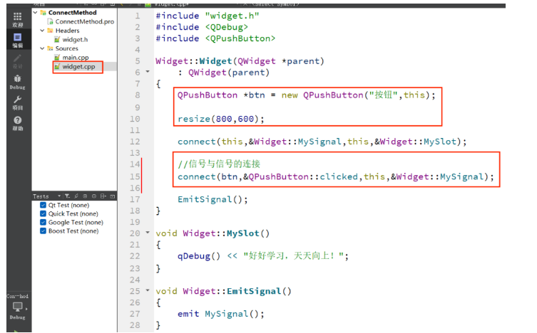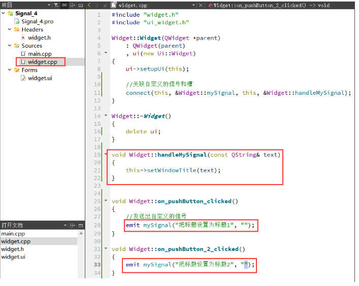 在 "widget.cpp" 中实现槽函数,信号发射函数以及连接信号和槽