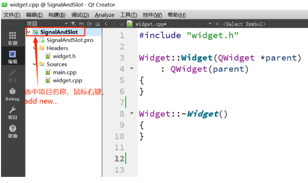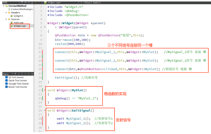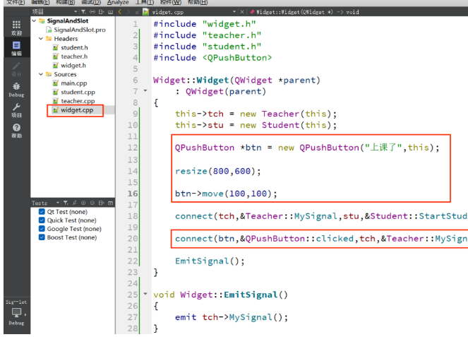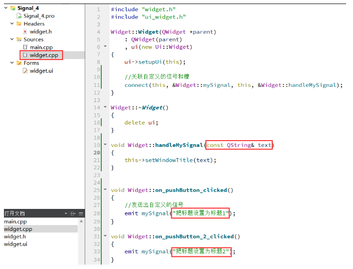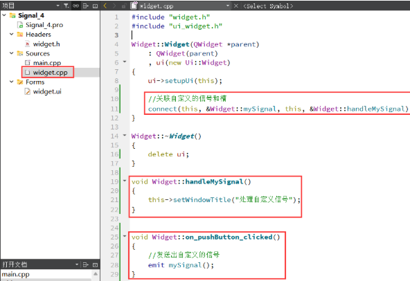 在上一段代码的基础上,在 "widget.cpp" 文件中添加如下代码:
