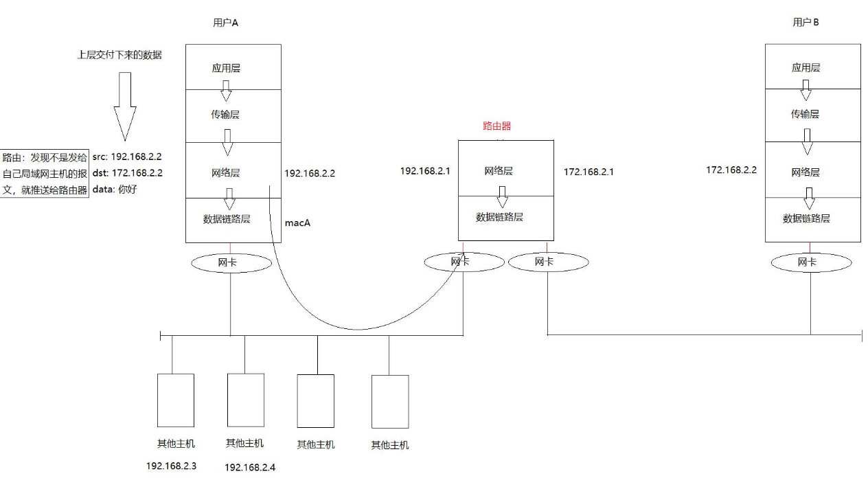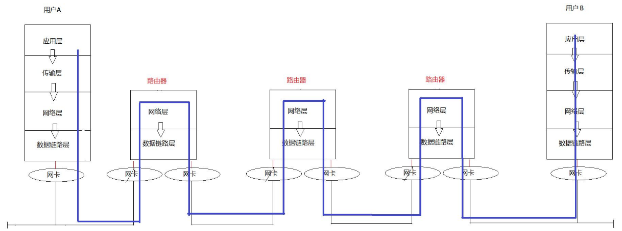 跨网段的主机的数据传输,数据从一台计算机到另一台计算机传输过程中要经过一个或多个路由器。