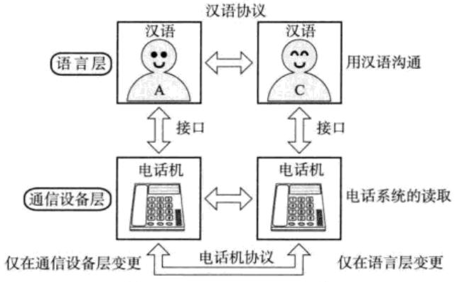 打电话时,我们的"协议"只有两层:语言层,通信设备层。