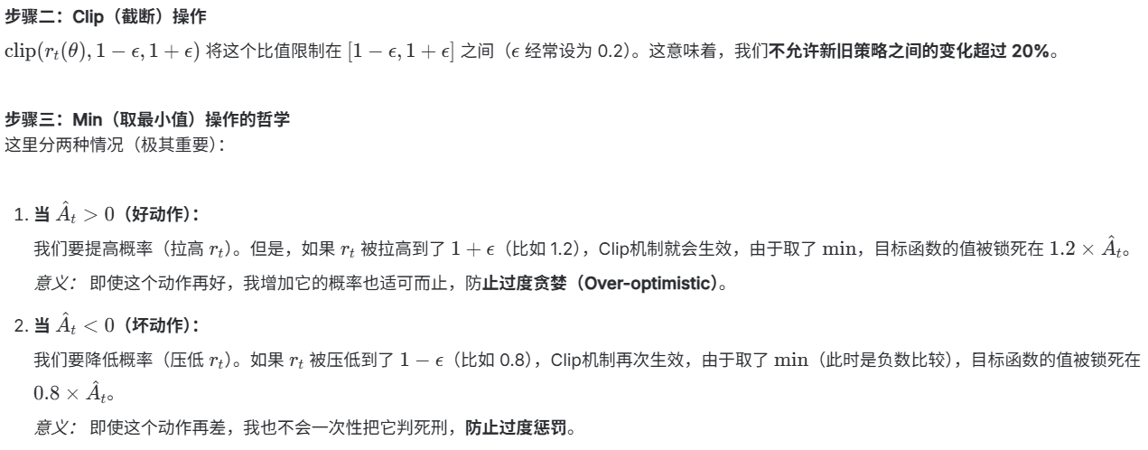 策略函数在比值超过设定的范围的时候,就会触发截止,然后直接把梯度设置为0,不再进行状态动作对的概率的更新了,因为动作更新幅度已经超过一定阈值了,不再进行梯度上面对参数的优化。