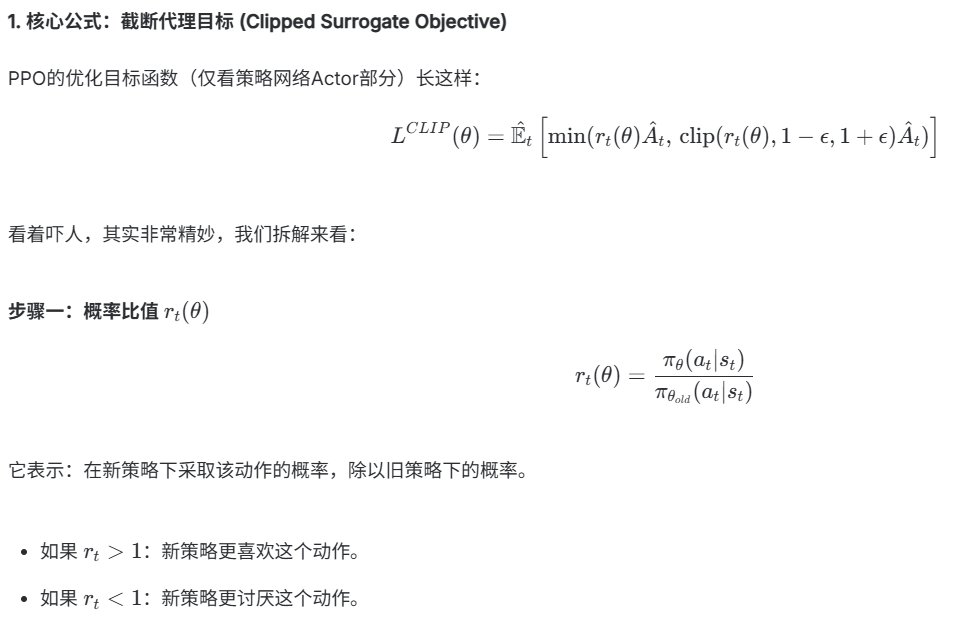 Critic(价值网络):输出状态的价值V(s),负责估计优势函数。