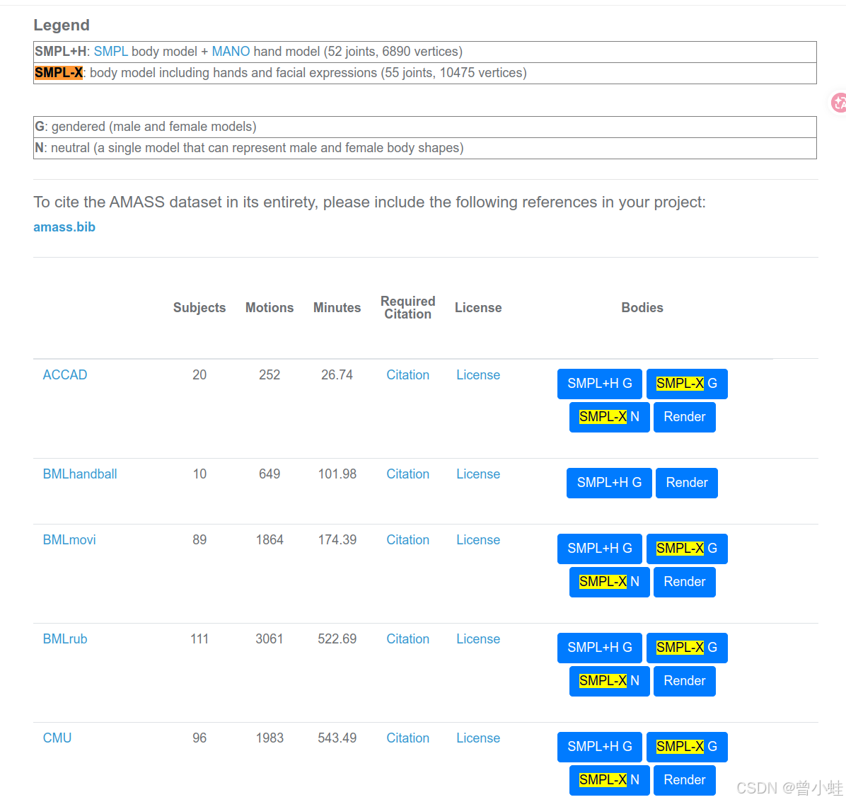 在 AMASS 页面里,一个数据子集旁边你可能会看到: