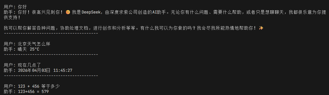 再简单描述下:代码先让AI判断用户想要什么(工具判断),然后Python执行具体的函数(工具执行),最后把结果返回给用户,中间最关键的就是需要我们自己设定一个模版提示词交给AI判断,然后返回设定好的结果,再去调用写好的工具。