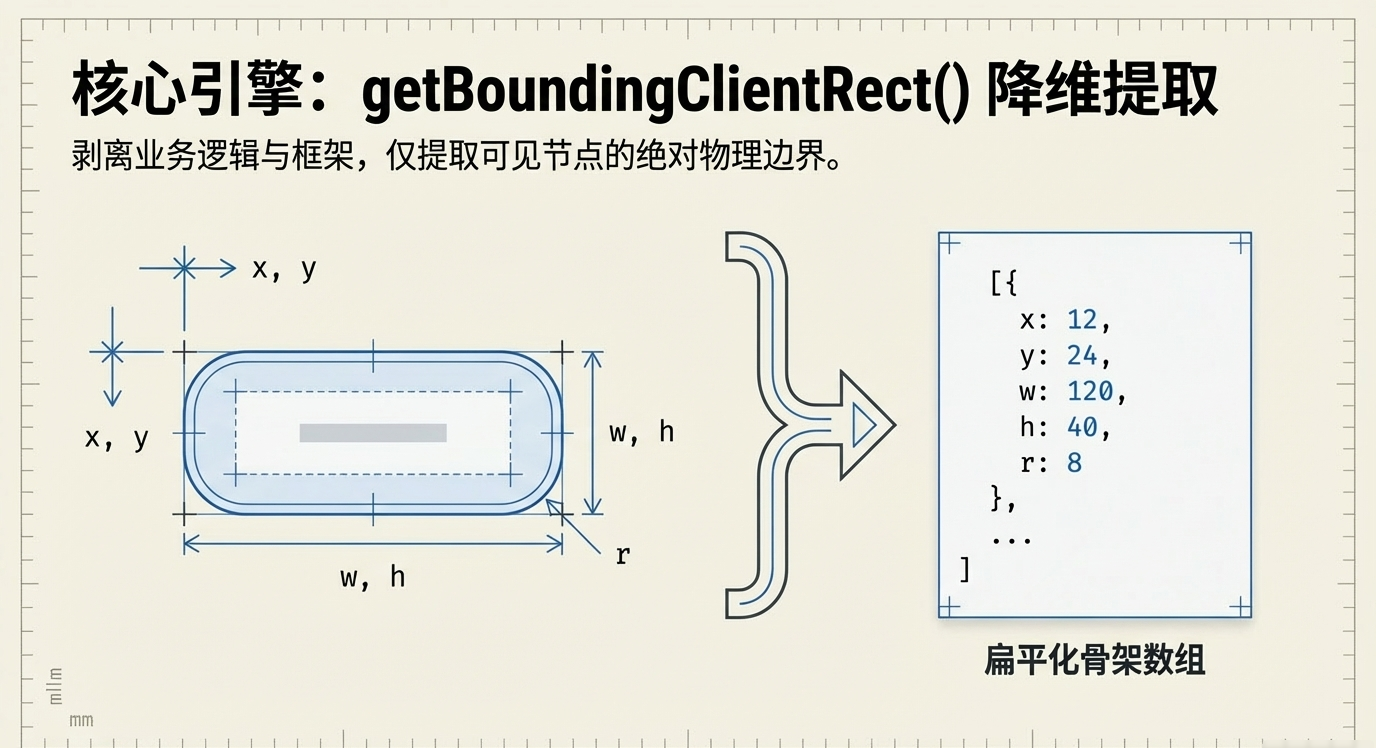 核心提取引擎的硬核之处在于直接调用浏览器底层的 getBoundingClientRect() API 进行空间数据降维。系统会暴力剥离所有的业务逻辑、事件绑定与交互框架,仅针对可见节点的绝对物理边界进行极速扫描。所有捕获到的坐标原点、尺寸信息以及边界圆角参数,会被瞬间压缩并展平为一个极其轻量的扁平化骨架数组,直接绕过了庞大 DOM 树的解析开销,实现了数据结构层面的极致轻量化。