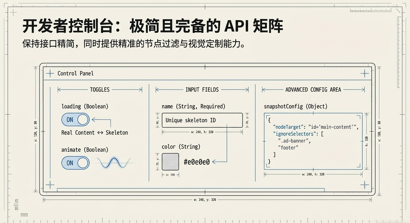 传统的骨架屏开发模式本质上是一场难以维护的灾难,其脆弱的架构犹如早期缺乏内存管理的 C++ 代码般极易崩溃。开发者往往深陷于无休止的 CSS 媒体查询与绝对定位调试之中,每一次微小的 UI 迭代都会引发多米诺骨牌式的占位符错位。硬编码的宽高比例与真实组件之间存在着天然的割裂感,繁琐的手工逻辑不仅耗费大量无价值的重复劳动,更在多端响应式适配时频频失效,最终沦为庞大且极易劣化的技术债隐患。