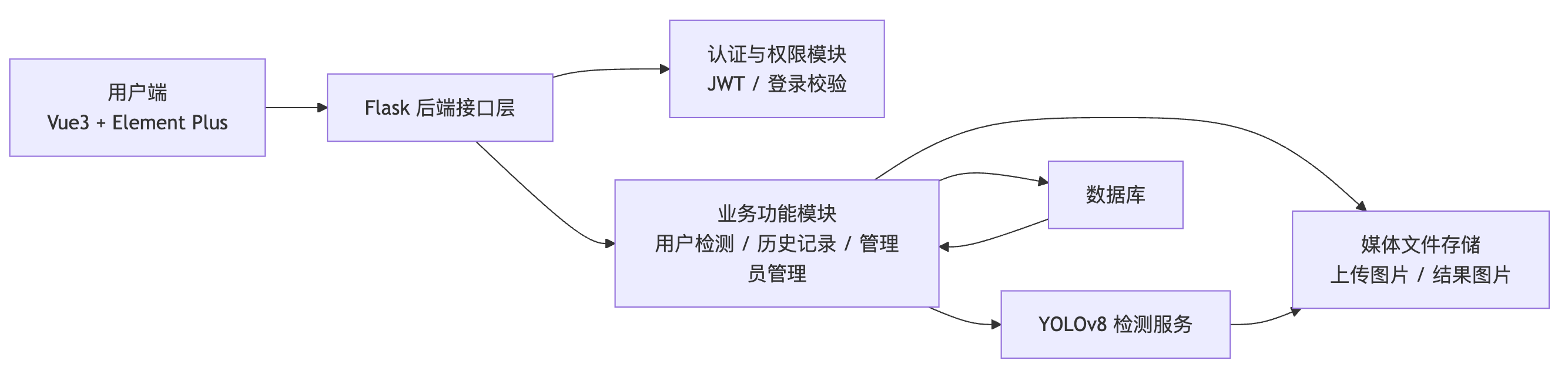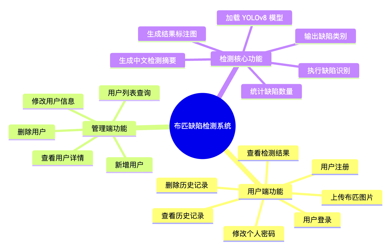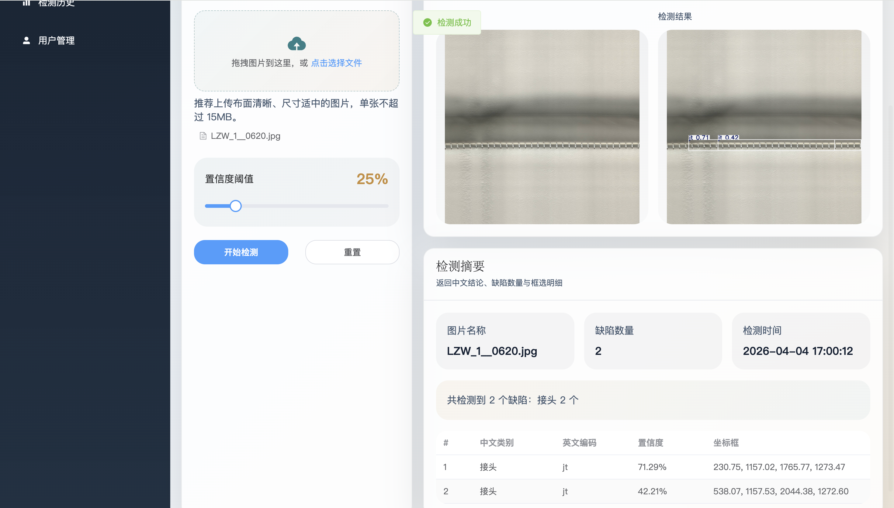 基于YOLO的布匹缺陷检测系统实现,整体采用"前后端分离 + 深度学习检测模型"的设计思路实现。前端基于 Vue3 与 Element Plus 搭建交互界面,负责完成用户注册登录、布匹图片上传、检测结果展示、历史记录查询以及管理员用户管理等功能;后端基于 Flask 框架构建 RESTful 接口,负责业务逻辑处理、身份认证、文件存储、检测记录持久化及模型调用。系统核心算法采用 YOLOv8,对布匹图像中的布接、接头、皱印、纸接、横档、纸皱等缺陷进行识别,并输出带标注的检测结果图、缺陷数量、缺陷类别及中文摘要信息。