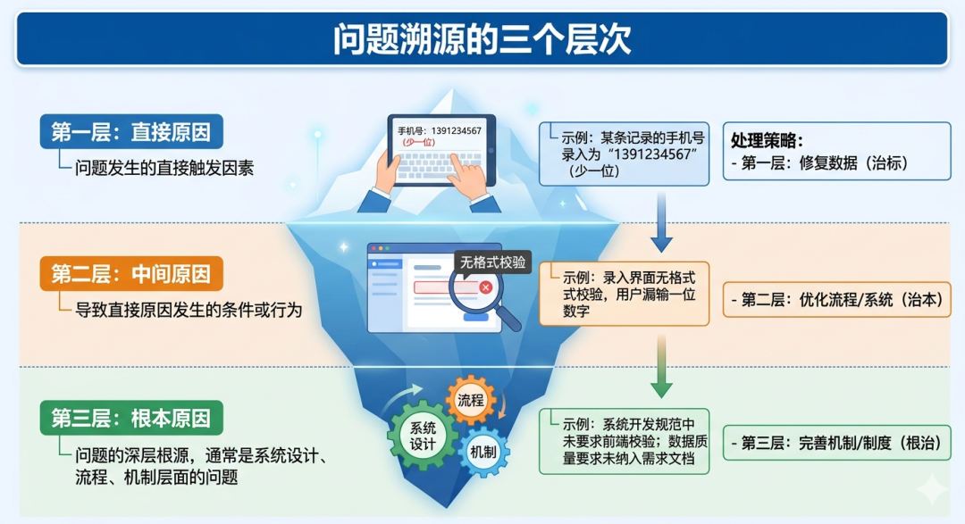 发现问题只是第一步。如果只解决表面问题而不追溯根源,同类问题必然会反复出现。根因分析是打破"重复问题"循环的关键。