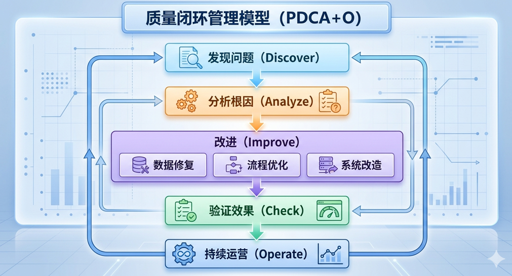 数据质量提升没有"一劳永逸"的解决方案。即使是最好的系统、最严格的流程,也无法保证100%的数据质量。质量提升的本质,是建立一套能够"持续发现问题、持续分析根因、持续推动整改、持续预防复发"的机制。