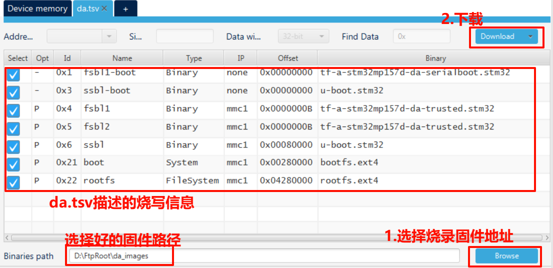 - 0x01 fsbl1-boot Binary none 0x0 tf-a-stm32mp157d-da-serialboot.stm32