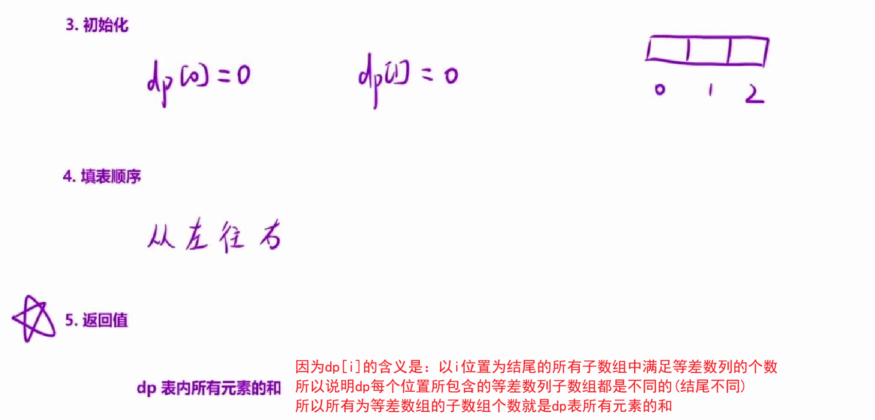 由于我们的研究对象是「一段连续的区间」,如果我们状态表示定义成[0,i]区间内一共有多少等差数列,那么我们在分析dp[i]的状态转移时,会无从下手,因为我们不清楚前面那么多的「等差数列都在什么位置」。所以说,我们定义的状态表示必须让等差数列「有迹可循」,让状态转移的时候能找到「大部队」。因此,我们可以「固定死等差数列的结尾」,定义下面的状态表示: