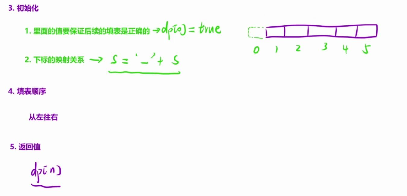 由「状态表示」可得:返回dp[n]位置的布尔值。