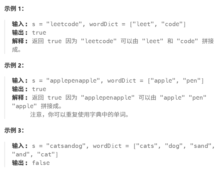 因此,我们得出一个结论:当我们在从o~i枚举j的时候,只要dp[j-1]=true并且后面部分的子串s.substr(j,i-j+1)能够在字典中找到,那么dp[i]=true。