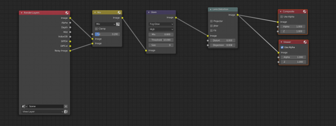 最后,谈到现实主义,关键步骤是要在Blender中制定一个扎实的合成计划。一般来说,Photoshop也能做到这些,但我发现Blender用最少的努力能带来更好的画面效果。增加眩光、镜头色散和保留部分图像噪点,大多数时候效果会大幅提升。我为这张图片制作的合成节点大致是这样的------没什么特别复杂的: