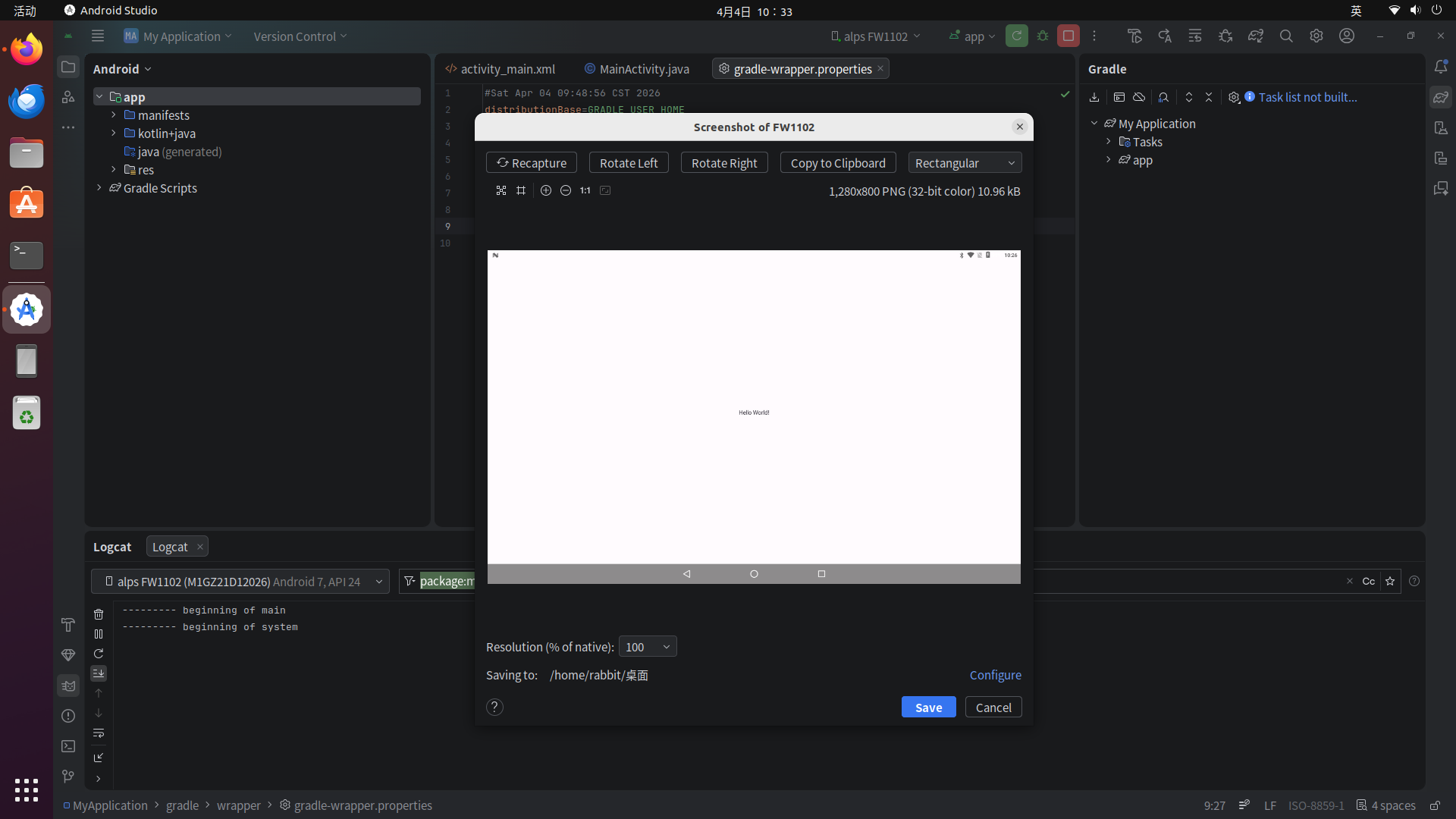 我的机器比较慢,经过7分钟的漫长等待后可以看到程序已经在虚拟设备上跑起来了,显示出了"Hello World!"内容: