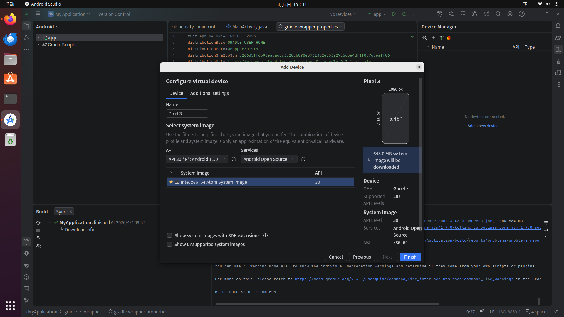 此时可以看到,界面上方设备的设备选项中已经是刚才建立好的Pixel 3虚拟设备了: