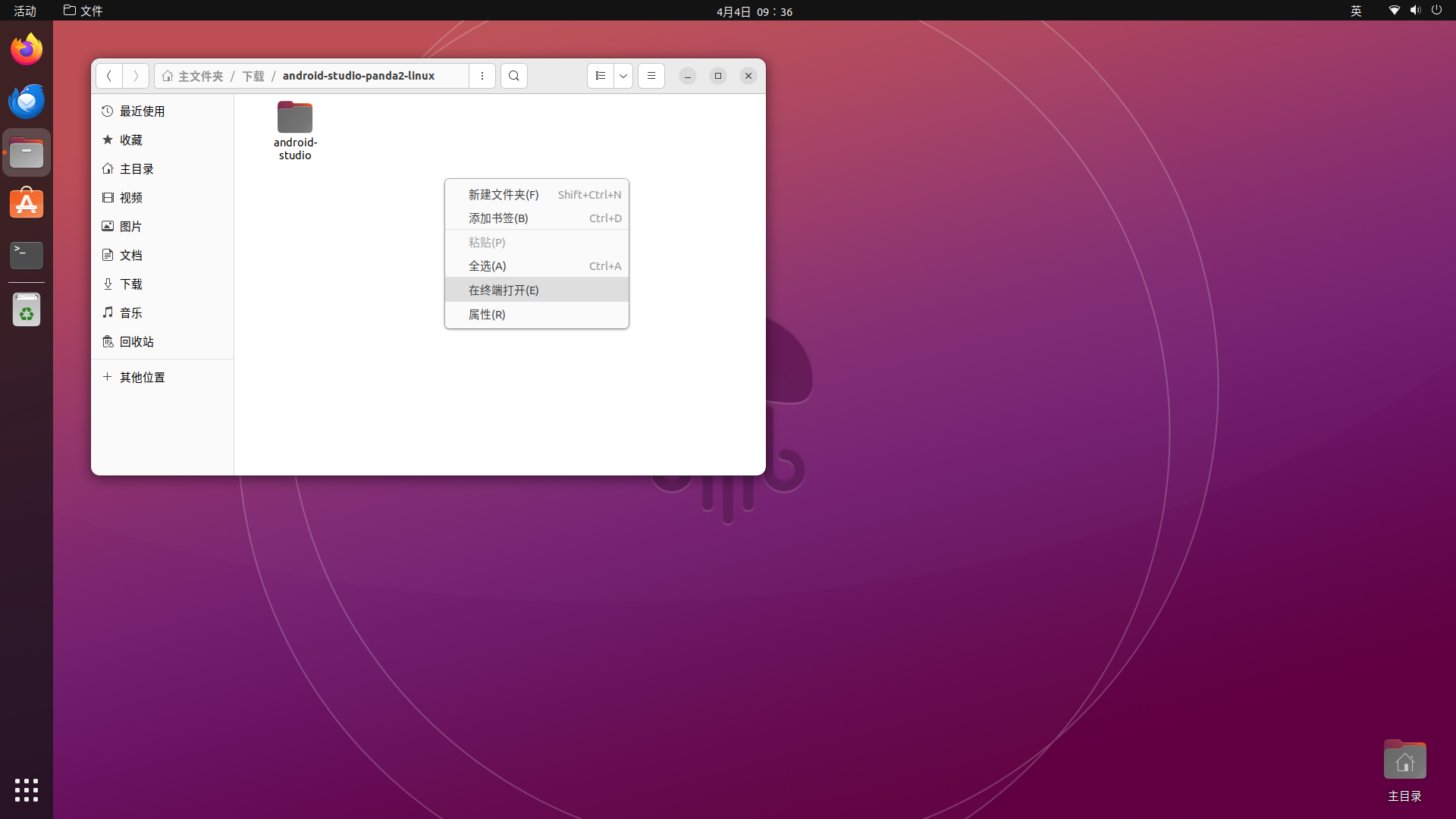 解压后是一个带版本号(如这个版本的"Panda")的文件夹,进入此文件夹后能看到一个不带版本号的文件夹,这时在窗口空白处点击右键,选择"在终端中打开":