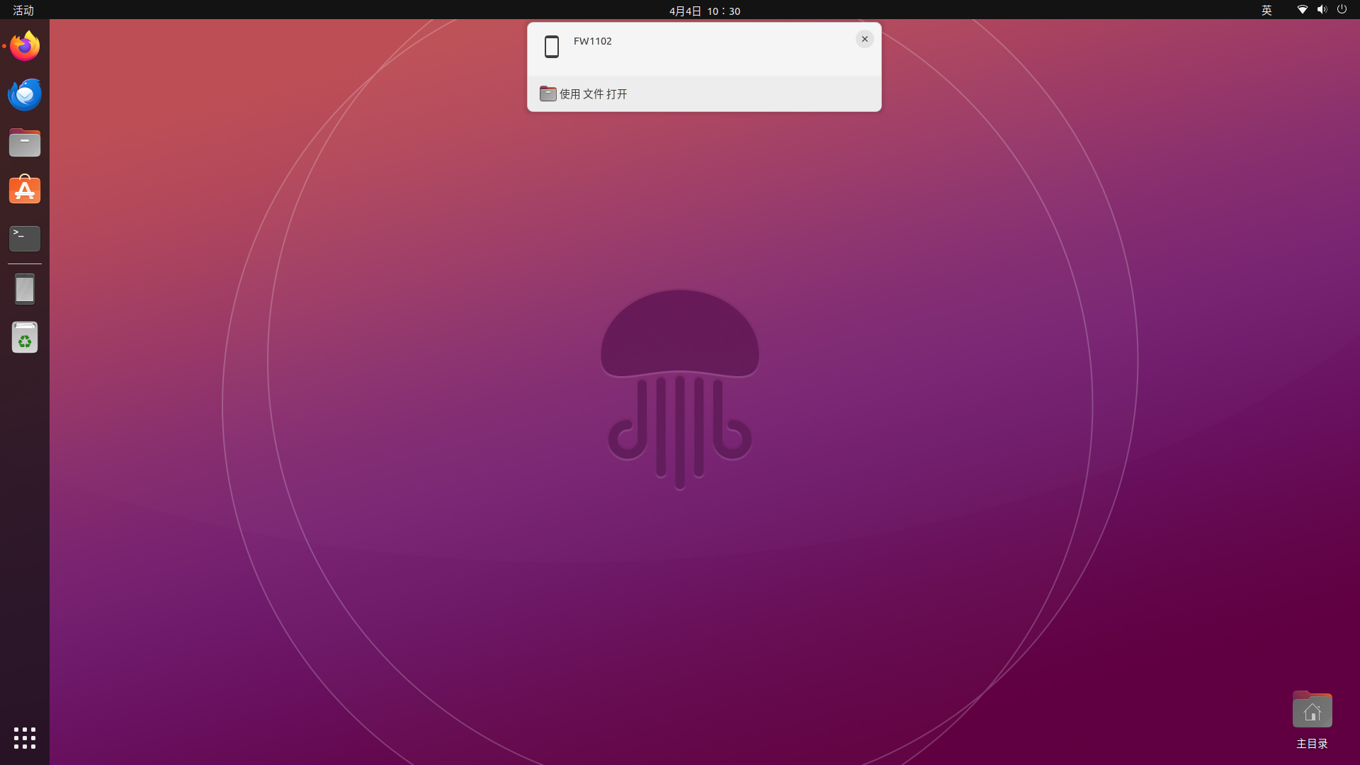 在实际上打开开发者模式,开启USB调试,USB连接配置选择"MTP",然后用USB数据线连接到电脑。一般Android设备连接到Linux系统都是免驱的,可以看到桌面山弹出了设备名字的提示: