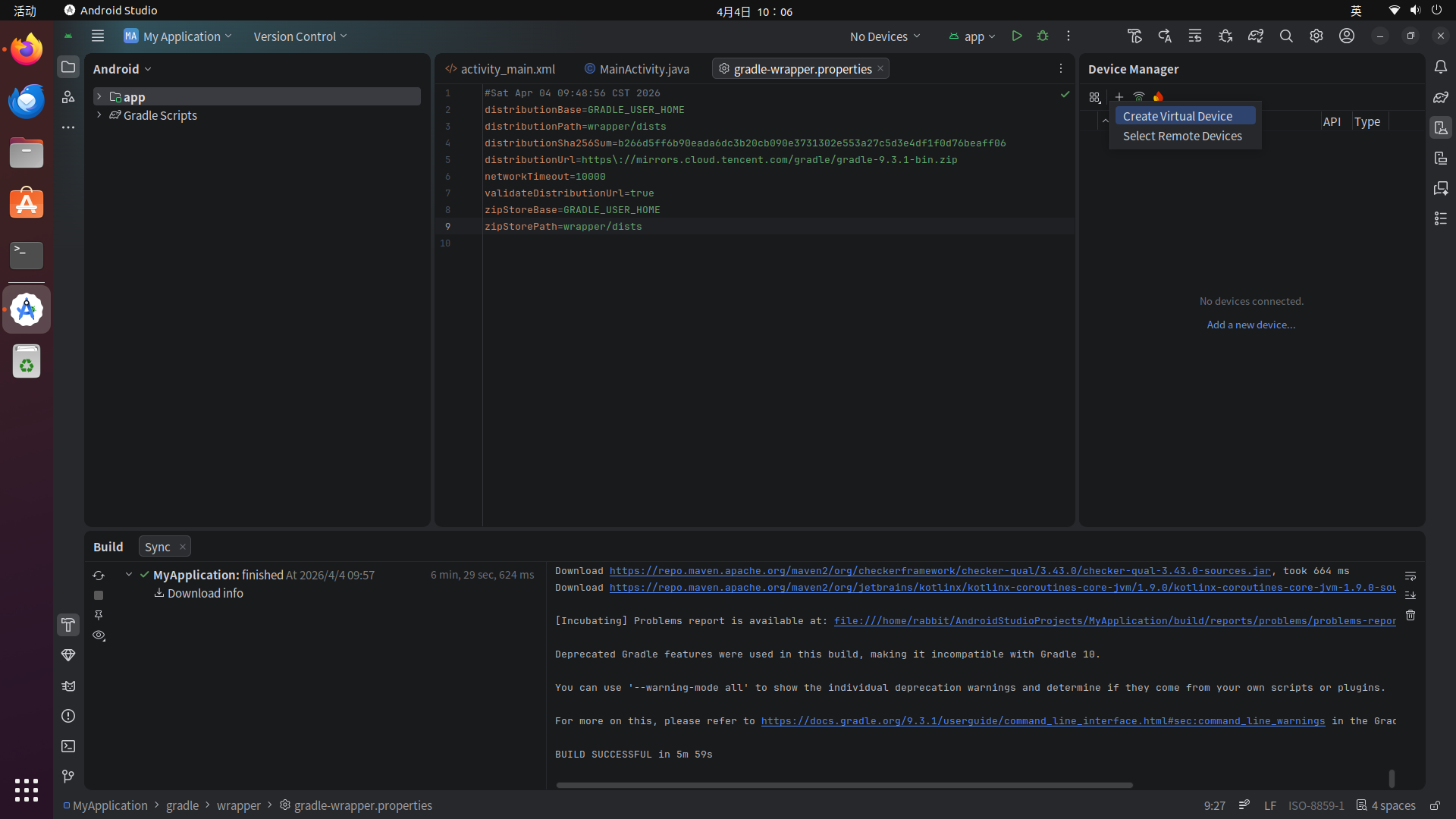 等待完成后,可以看到上方设备列表中是"No Device"的状态,尽管Android Studio在首次安装时已经安装了Android Emulator,但是在新建的工程中同样需要手动新建虚拟设备,这一点和Windows和macOS也不太一样。