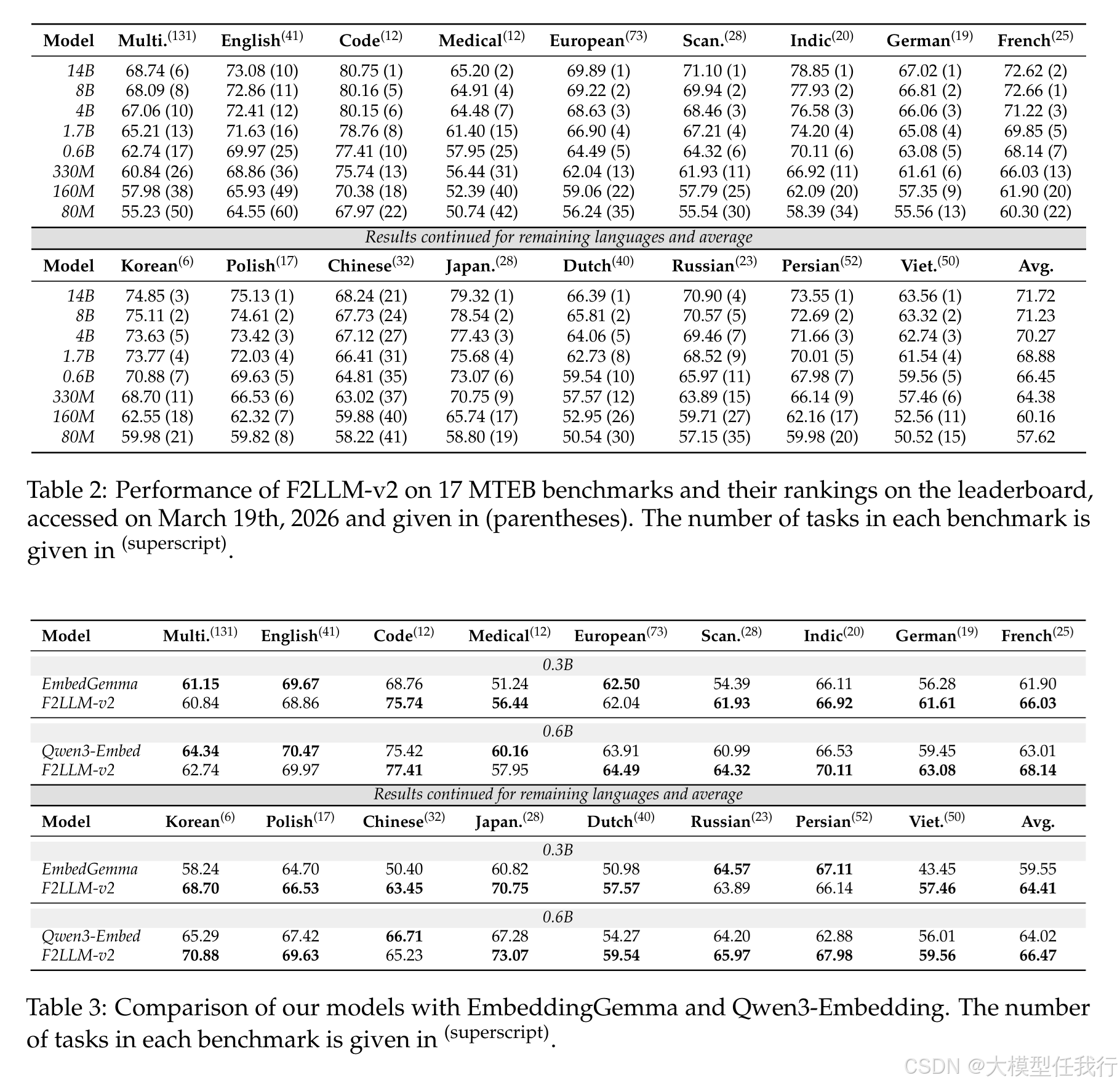 🔸F2LLM-v2-14B 模型在 17 个 MTEB 基准测试中的 11 个上取得了最先进成绩,特别是在代码、医疗及多个特定语言(如波兰语、日语)榜单上表现卓越。