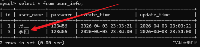 那么按理来说的话,数据库中应该会有两条数据,张三和李四,而我们执行了回滚操作,所以导致李四这条数据是没有被插入到数据库中的,所以数据库中仍然只有张三这条数据,此时就代表我们回滚成功: