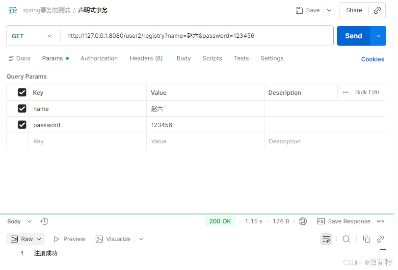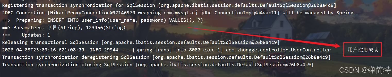 然后你看后面我们的后端打印出来影响行数是一这样的一个注册成功的数据,说明目标方法已经执行了,也就代表你这个数据难道已经插入到数据库里面去了吗?