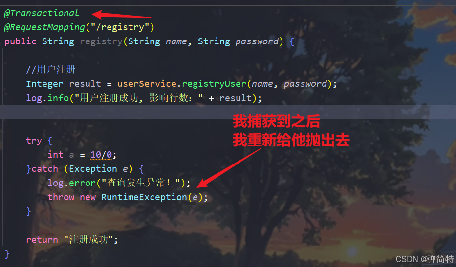 那我如果说出现了异常,然后你去捕获了异常,但是我又不希望你去抛出异常(只要不抛出事务就不会帮我们回滚),但是此时我偏要事务去给我们进行回滚。怎么做? 请继续往下看
