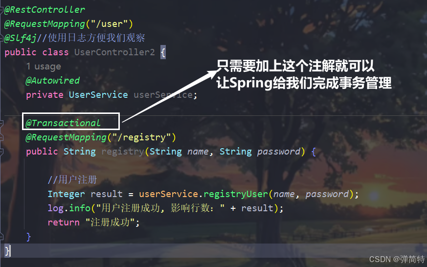 也就是说呀,从这个图中我们是要明白:如果你发生异常,然后你自己去try-catch了,自己手动去处理这个异常,然后只要你不去重新抛出这个异常的话,那么我们的spring是不会去帮我们回滚的,而我们现在的需求是,我既想要去手动处理异常,不重新抛出异常,然后我也想去让你帮我去回滚,此时我们需要实现这个需求,就得自己去手动回滚事务。