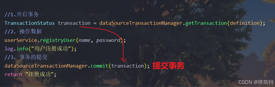 那么在讲注解实现事务之前呢,我们先思考一个问题,我们上述手动编写代码去完成事务的操作,也就是编程事务,我们呢有没有发现一个特点?